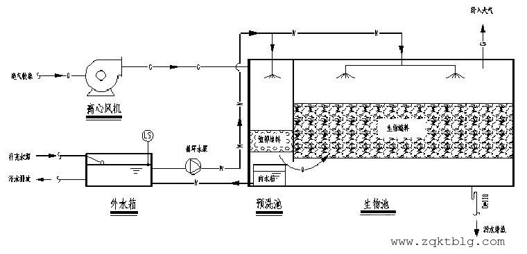 惡臭氣體收集裝置→生物過濾裝置→抽風(fēng)機(jī)→達(dá)標(biāo)排放↕過濾器→濾渣定期排放 除臭生物濾池厚田液體噴淋裝置: