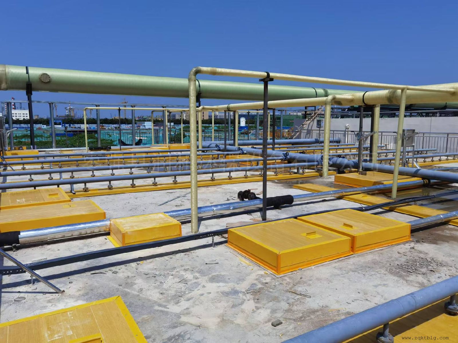 4、各池玻璃鋼蓋板分類、分編號進(jìn)行現(xiàn)場組裝,成塊鋪設(shè)。