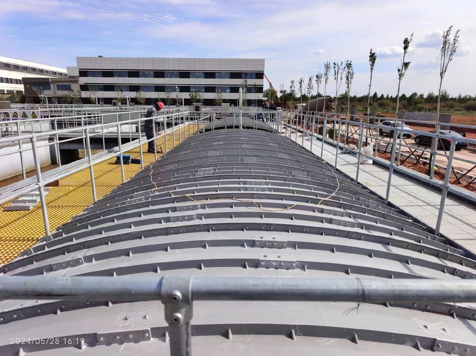 玻璃鋼拱形蓋板與池壁接口處鋪設(shè)彈性密封墊,通過法蘭螺栓壓緊;